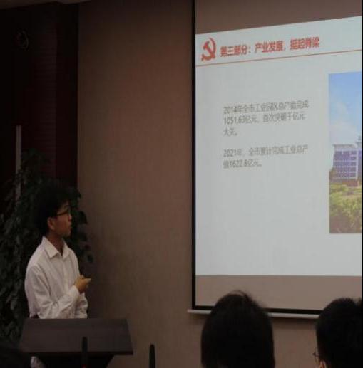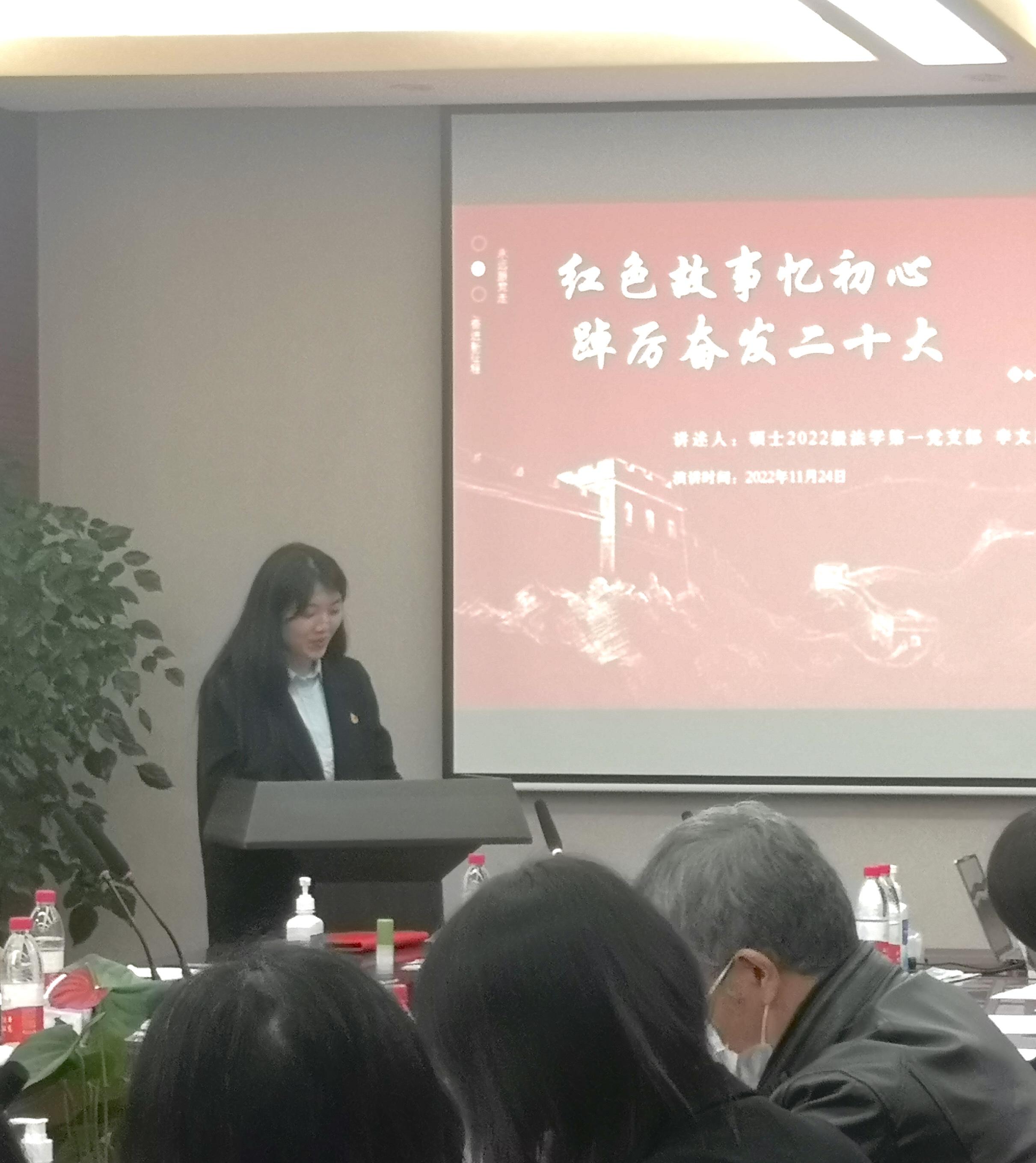 随后,各学生党支部代表围绕学习贯彻党的二十大精神作主题宣讲。本科第一党支部的黄克胜、硕士2022级公管第一党支部的黎玉婷和余左莉、研究生会临时党支部的高天、硕士2022级公管资环第二党支部的刘倩、硕士2022级法学第一党支部的李文凤、本科第二党支部的屈雅琪和李佳颖分别进行了题为《百色十年巨变》《时代向前吾辈向上》《千年夙愿今梦圆,乡村振兴谱新篇》《四色述家乡,讴歌二十大》《红色故事忆初心,踔厉奋发二十大》《襄阳好风光,佳绩添辉煌》的宣讲展示。通过青年党员讲述家乡的面貌变化和身边成就故事,讴歌党的十八大以来的伟大成就,展现新时代青年热爱党,热爱祖国,奋发向上的故事,推进红色基因代代相传。支部汇报展示结束后,与会党员通过视频学习的方式重温了中国共产党第一次全国代表大会,领悟伟大建党精神。伟大建党精神凝结着中国共产党百年奋斗的优良传统和宝贵品格,是新时代中国共产党人继续砥砺前行的强大动力,是实现第二个百年奋斗目标的强大精神武器。
