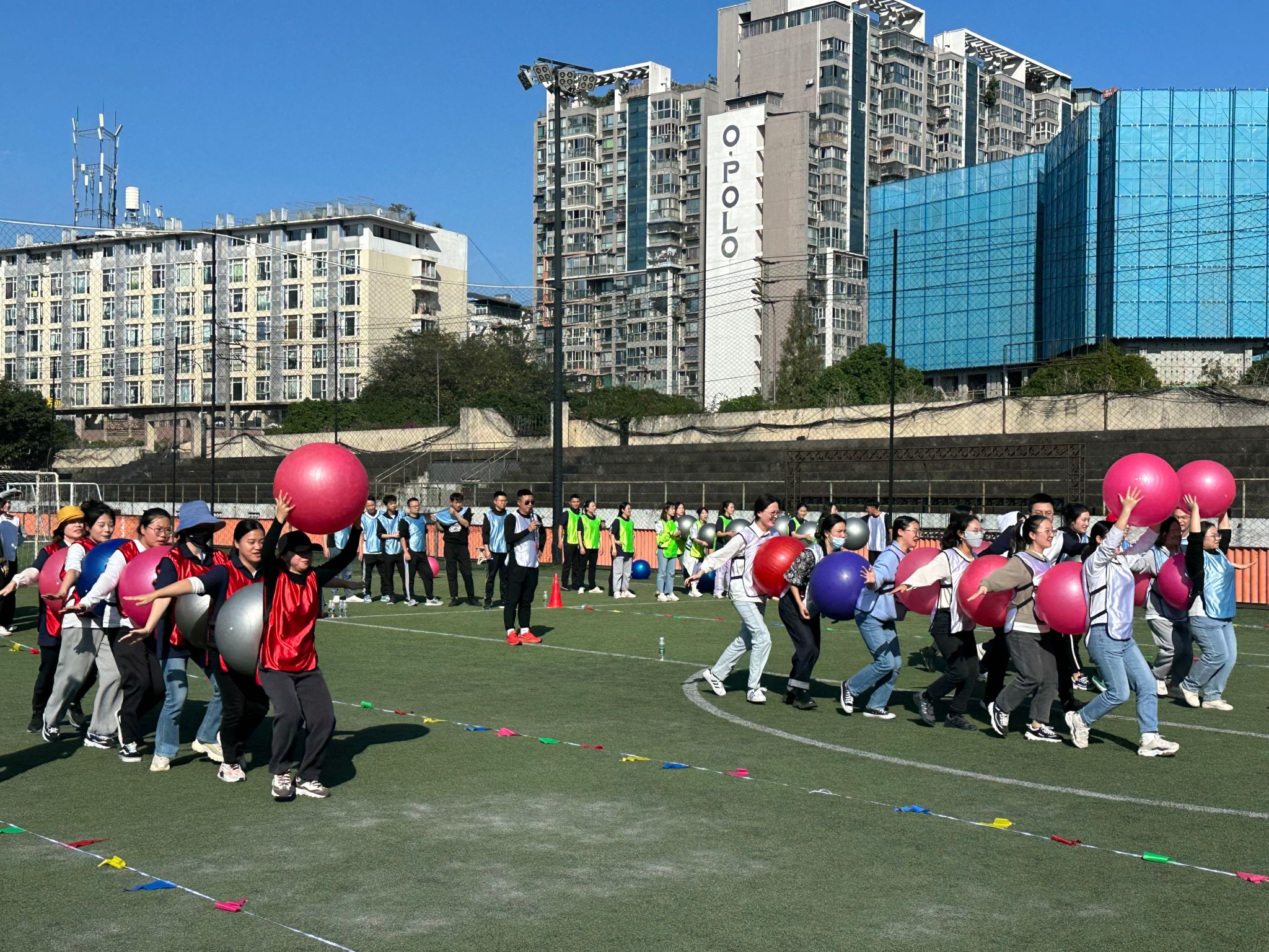 在“蜈蚣竞走”中,队员需要相互之间用身体前后夹着大圆球,同时双手举起另一个大圆球,在球不落地的情况下,列成纵队向前奔跑,进一步增强同学们的合作意识和合作能力。