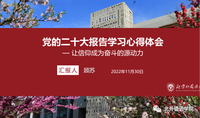 会议的第三部分,支部入党积极分子、Beat365中文官方网站青年教师代表顾苏分享了学习二十大报告的心得。她认为,二十大报告系统回顾总结了新时代十年的伟大变革,科学擘画了未来中国发展的宏伟蓝图,其中突出强调了教育、科技和人才的作用。作为具有鲜明“红色基因”的北外教师,我们应不忘初心、牢记使命,为党育人,为国育才,切实将二十大精神有机融入到教学工作中;发挥自身的学科优势,为构建中国特色的学科、学术体系以及话语体系添砖加瓦,把服务国家作为科研工作的最高追求。她结合个人参与庆祝中德建交50周年《中德大咖谈》节目录制的经历,认为外语教师应力求在大格局下讲好小故事,向世界发出中国声音。