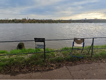 (上学路上莱茵河畔的座椅)