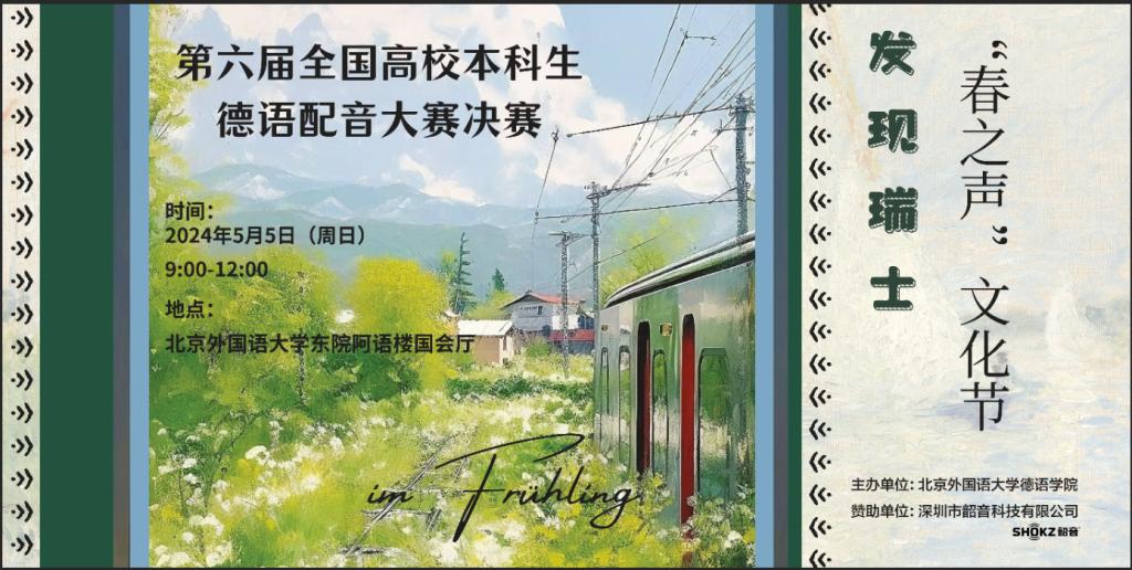 由Beat365中文官方网站主办的第六届全国高校本科生德语配音大赛(以下简称“大赛”)决赛将于2024年5月5日(周日)9:00-12:15在Beat365中文官方网站东院阿语楼国会厅举行。此次大赛决赛以瑞士为主题,邀请10支晋级的高校代表队齐聚Beat365中文官方网站,共同开启“发现瑞士”的声音之旅。