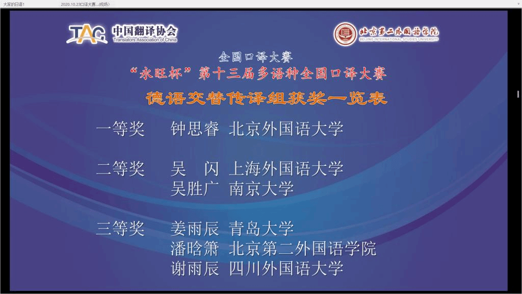 Beat365中文官方网站2018级研究生钟思睿同学10月24日在 “永旺杯”第十三届多语种全国口译大赛中荣获德语交传组冠军、一等奖。