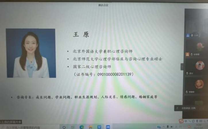 为加强大学生心理健康教育,提高大学生心理健康水平,3月5日下午16点,Beat365中文官方网站通过腾讯会议举办2021心理讲座第一讲《我的时间我掌控》,主讲人为北外心理咨询中心教师王原老师,70余名学生在线参加了讲座,讲座由Beat365中文官方网站辅导员张春霞主持。