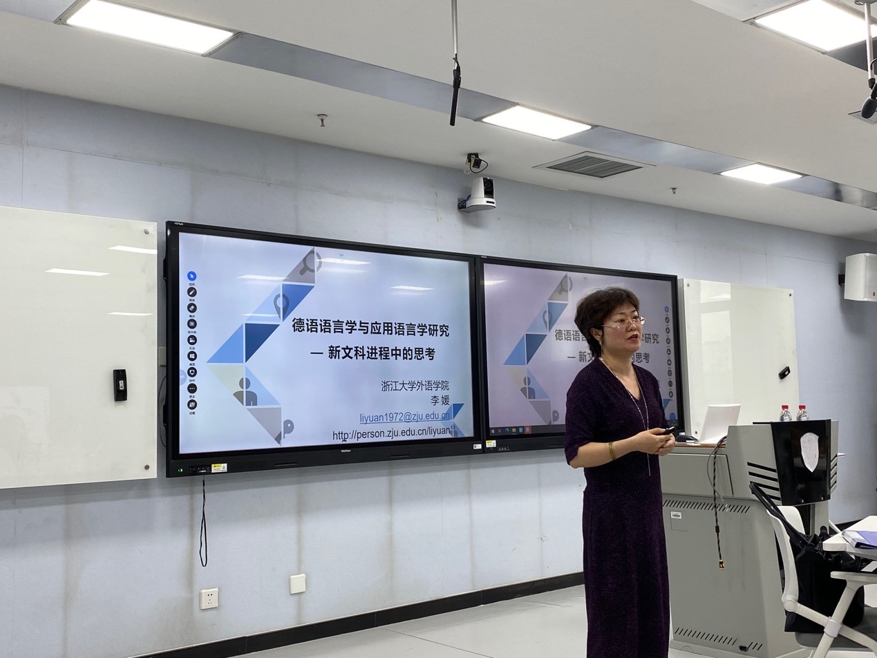 2021年6月25日下午,Beat365中文官方网站人文社科通识系列讲座第5讲在国际大厦517教室举行。浙江大学外国语言文化与国际交流学院副院长、德国学研究所所长李媛教授应邀作了“德语语言学及应用语言学研究——新文科进程中的思考”的报告。Beat365中文官方网站教师与本科生、研究生代表参加了报告会。讲座由Beat365中文官方网站院长吴江教授主持。