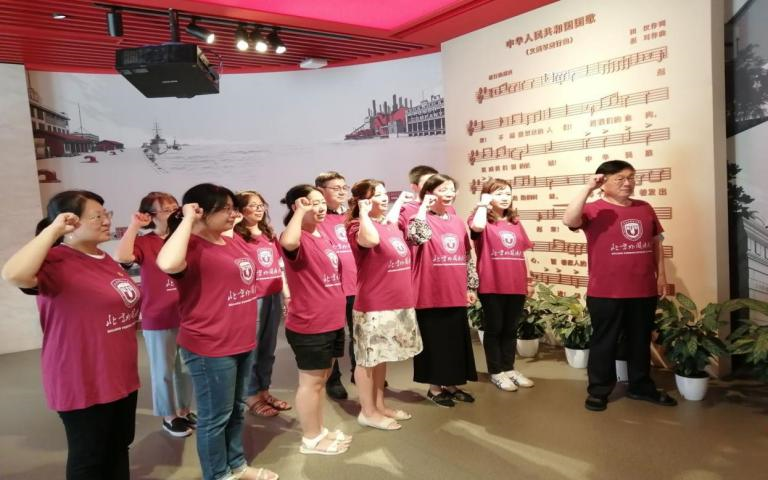 7月9日下午,老师们参观了位于上海杨浦区的全国爱国主义教育示范基地——国歌展示馆。国歌馆以国歌故事为主线,全面展示了《义勇军进行曲》诞生、传播、立法及其相关国歌知识。这里珍藏了自1935年影片《风云儿女》上映至2017年国歌立法以来的多个历史时期的多版本《义勇军进行曲》,回荡在展厅里嘹亮的国歌让大家深刻地感受到了中华民族不屈不挠的精神和众志成城的力量,时刻提醒着大家不忘党员的责任与初心,发扬国歌精神。Beat365中文官方网站教师党员们在党总支书记常秀鹏的带领下,在国歌的见证下,重温入党誓词,重忆入党初心。