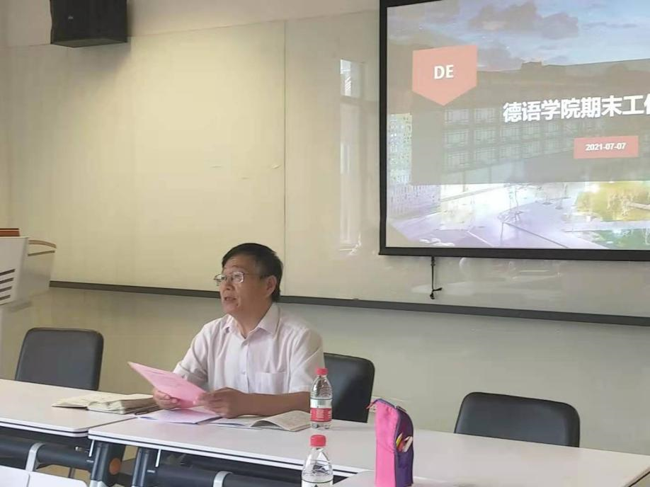 第二个环节是期末总结,基础教研室主任李婧、文学教研室任卫东、语言学教研室主任葛囡囡、翻译教研室主任顾牧、德国外交教研室主任李文红、德国经济教研室主任徐四季、跨文化教研室主任赵倩、教师党支部书记张晓玲依次汇报了本学期本教研室和教工支部工作完成情况及取得的成绩。之后副院长姚晓舟汇报了本学期本科生各项教学管理工作及全国德语专业八级测试的相关情况,副院长姚燕汇报了研究生各项教学管理及外事工作情况,并传达了学校研究生督学的反馈意见。