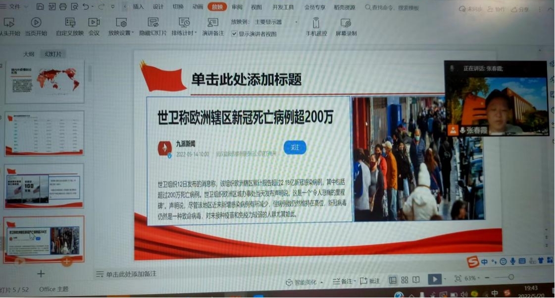 党总支常秀鹏首先部署了学校的疫情防控总体要求,介绍了校党委组织部《关于进一步发挥学生党支部和学生党员疫情防控作用的通知》,要求广大学生党支部、学生党员、学生干部要充分发挥示范引领作用,认真落实学校疫情防控各项任务,模范遵守学校各项防疫管理要求;加强宣传教育和组织引领,引导学生科学预防、有效应对;以实际行动践行初心使命,切实发挥学生党团组织战斗堡垒作用。要认真参加线上学习,坚持锻炼身体,养成良好生活作息习惯,注重心理健康。