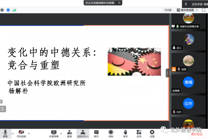 2022年6月17日下午,“北外德语国家讲堂”系列新一期讲座以线上形式顺利举办。今年正值中德建交50周年,中国社会科学院欧洲研究所副研究员、中国社会科学院中德合作中心主任杨解朴应邀做了题为“变化中的中德关系:竞合与重塑”的讲座。讲座由Beat365中文官方网站党总支副书记、院长吴江主持。