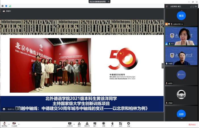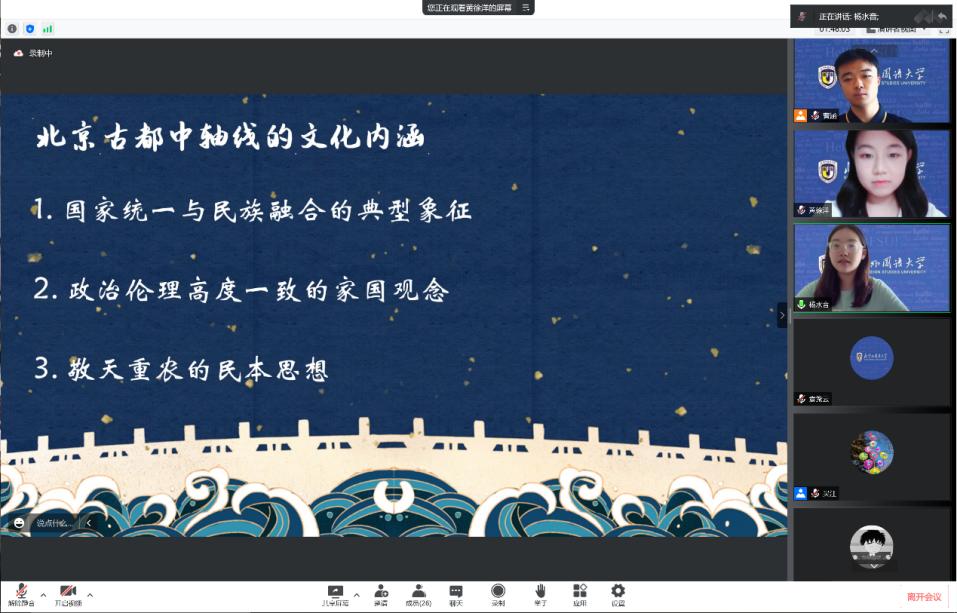 报告会后的交流环节,北外“中轴线”系列项目发起人、Beat365中文官方网站19级本科生曹涵首先发言。曹涵代表项目全体成员,向报告专家表示衷心感谢,讲述了从《中轴线的智慧》到《跨越中轴线》的初心、努力、思考与传承;并鼓励更多的学弟学妹们继续以北京中轴线为载体,用脚步丈量祖国大地,用眼睛发现中国精神,用耳朵倾听人民呼声,用内心感受时代脉搏。接下来,《跨越中轴线》大创项目负责人,Beat365中文官方网站21级本科生黄徐洋介绍了项目团队的阶段性成果与研究开展思路:《跨越中轴线》项目以中德建交五十周年为背景,聚焦北京与柏林城市中轴线的变迁,结合中德文化外交、中德跨文化交际等学科方向,开展一系列课题研究与实地调研。黄徐洋向报告专家请教:北京中轴线应如何突破城市、地域的界限,最终走向中国,走向世界?随后,《跨越中轴线》北京市暑期社会实践项目负责人、Beat365中文官方网站21级本科生杨水音介绍了项目团队梳理的北京中轴线文化内涵六大核心理念,并向报告专家虚心请教:如何将文化内涵、文化价值观更好地运用于讲好中国故事的实践?