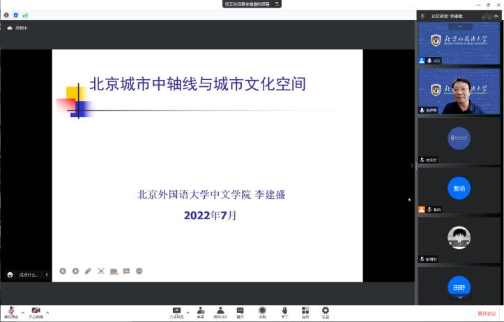 2022年7月13日下午,北外Beat365中文官方网站人文社科通识系列讲座第9讲于线上顺利举办。Beat365中文官方网站中文学院执行院长李建盛围绕“北京城市中轴线与城市文化空间”这一主题进行了学术分享。讲座由Beat365中文官方网站党总支副书记、院长吴江主持。