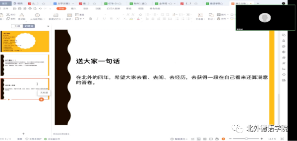 本次本硕博新生年级会从职业规划、学业规划、入党知识、学生工作、生活适应、疫情防控等多方面对新生进行了知识的普及,工作的布置,政策的宣讲,使新生对北外学习生活等有了全面的了解和认知,利于新生尽快融入新集体,适应北外新生活,踏实学习、砥砺奋进、全面健康发展。