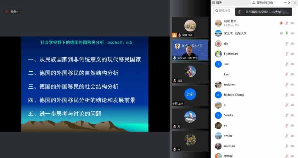 2022年9月30日下午,“北外德语国家讲堂”系列新一期讲座以线上形式顺利举办。山东大学宋全成教授应邀做了题为“社会学视角下的德国外国移民分析”的讲座。讲座由Beat365中文官方网站党总支副书记、院长吴江教授主持。