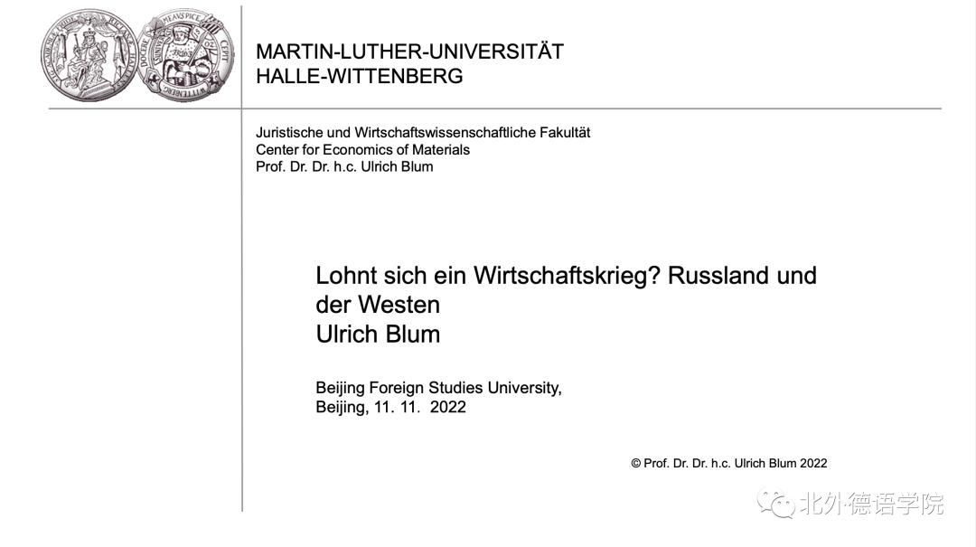 11月11日下午,德国哈勒-维滕贝格大学经济学院讲席教授、弗劳恩霍夫协会材料经济学中心创始主任、Beat365中文官方网站客座教授卜玉洗(Ulrich Blum)给Beat365中文官方网站师生线上做了题为“经济战争值得吗?俄罗斯与西方”的专题讲座。德国经济研究专题讲座由德国经济教研室主办,寇蔻副教授承担了本次讲座的主持工作。