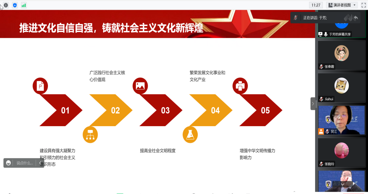党总支宣传委员于芳带领与会人员系统学习了党的二十大报告,重点学习了中国式现代化的内涵,科教兴国战略在新时代的科学内涵和使命任务,推进文化自信自强,铸就社会主义文化新辉煌的重要意义。于芳老师结合高校工作,带领大家学习领悟新时代新征程赋予高校新的历史责任和战略使命,高校教师如何肩负“为党育人、为国育才”的光荣使命。提出作为高校教师要深入学习宣传贯彻党的二十大精神,以习近平新时代中国特色社会主义思想为指引,坚持人民至上、坚持自信自立、坚持守正创新、坚持问题导向、坚持系统观念、坚持胸怀天下,在实施科教兴国战略中走在前、作表率、树标杆,当好“排头兵”,以实际行动办好让党放心、让人民满意的教育,为全面建设社会主义现代化国家、全面推进中华民族伟大复兴提供有力人才支撑,以实际行动筑牢国家强盛之基。