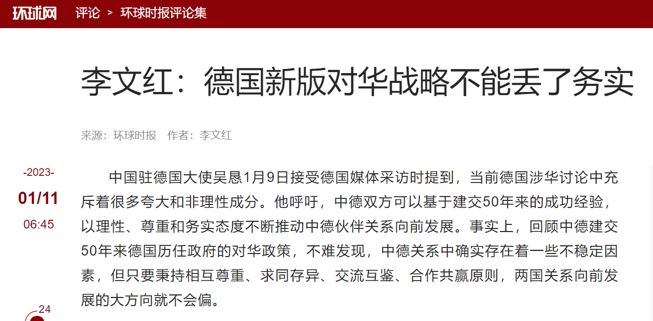 2023年1月11日,李文红教授在《环球时报》发表文章《德国新版对华战略不能丢了务实》。针对目前德国政府正在制定的新对华战略,文章认为中德关系应秉持相互尊重、求同存异、交流互鉴、合作共赢原则。经贸合作是推动中德关系稳定向好发展的一大动力,促进世界多极化发展是中德双方的共同关注。双方需要以理性务实且相互尊重的态度助力中德关系稳定向好发展。