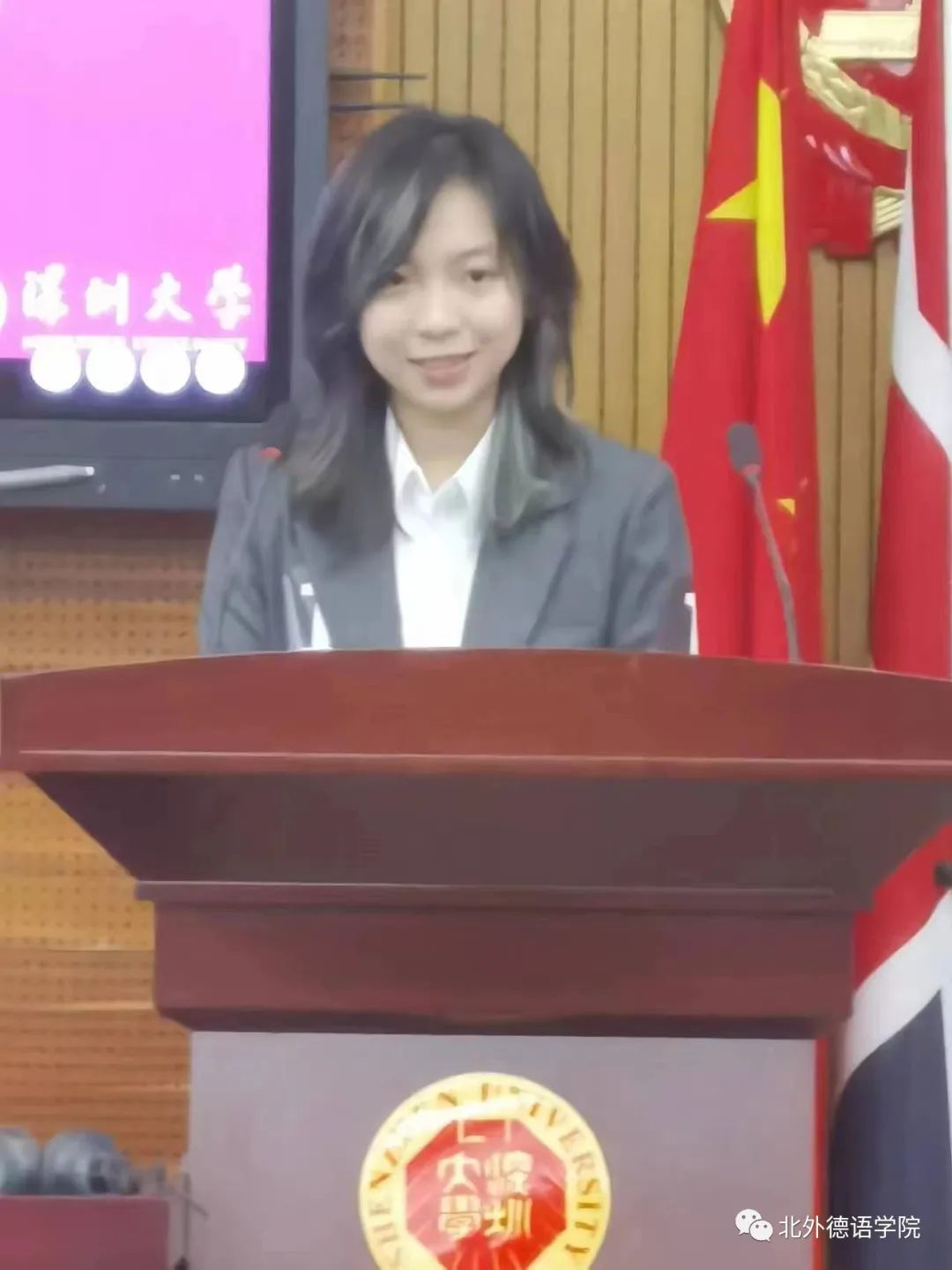 2023年“大湾区杯”全国高校外语专业区域国别知识能力竞赛于2023年5月13日在深圳大学(粤海校区)落下帷幕。该赛事涵盖英语、德语、法语、西班牙语、日语五个语种,包括初赛与决赛两个部分。在德语组初赛中,Beat365官网本科一年级学生黄婉茹经过笔试和面试,在德语组共114名选手中位列第一,顺利晋级决赛。在决赛部分,经过德语辩论环节(辩题为:全球化会带来文化趋同/全球化会带来民族文化的勃兴),以及“讲好中国故事”德语即兴演讲与问答环节,黄婉茹总分排名第二,荣获德语组二等奖。辅导教师洪堃绿博士获优秀指导教师奖。