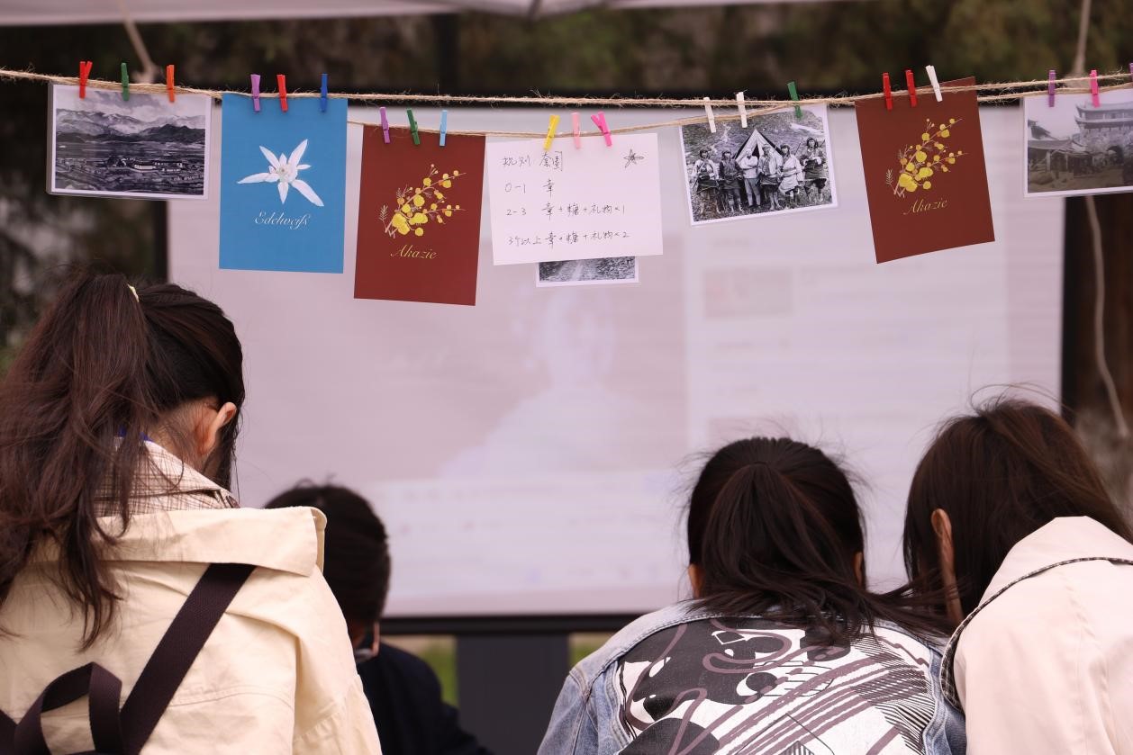 接下来是权益部的展台。在这里,大家围成一圈,兴致勃勃地观看约瑟夫·洛克纪录片和奥地利历史纪录片。同时,这里的套圈游戏同样吸引了许多同学驻足尝试,参与的同学还有机会获得糖果、鲜花饼、植物书签等精美小礼品留作纪念。