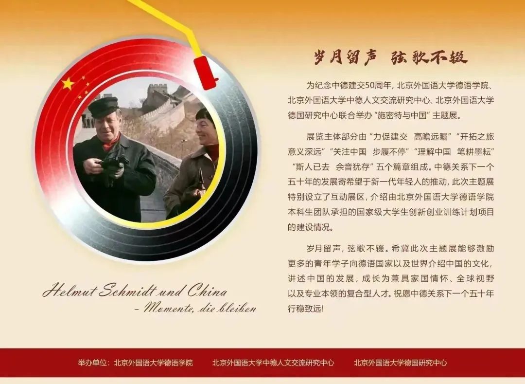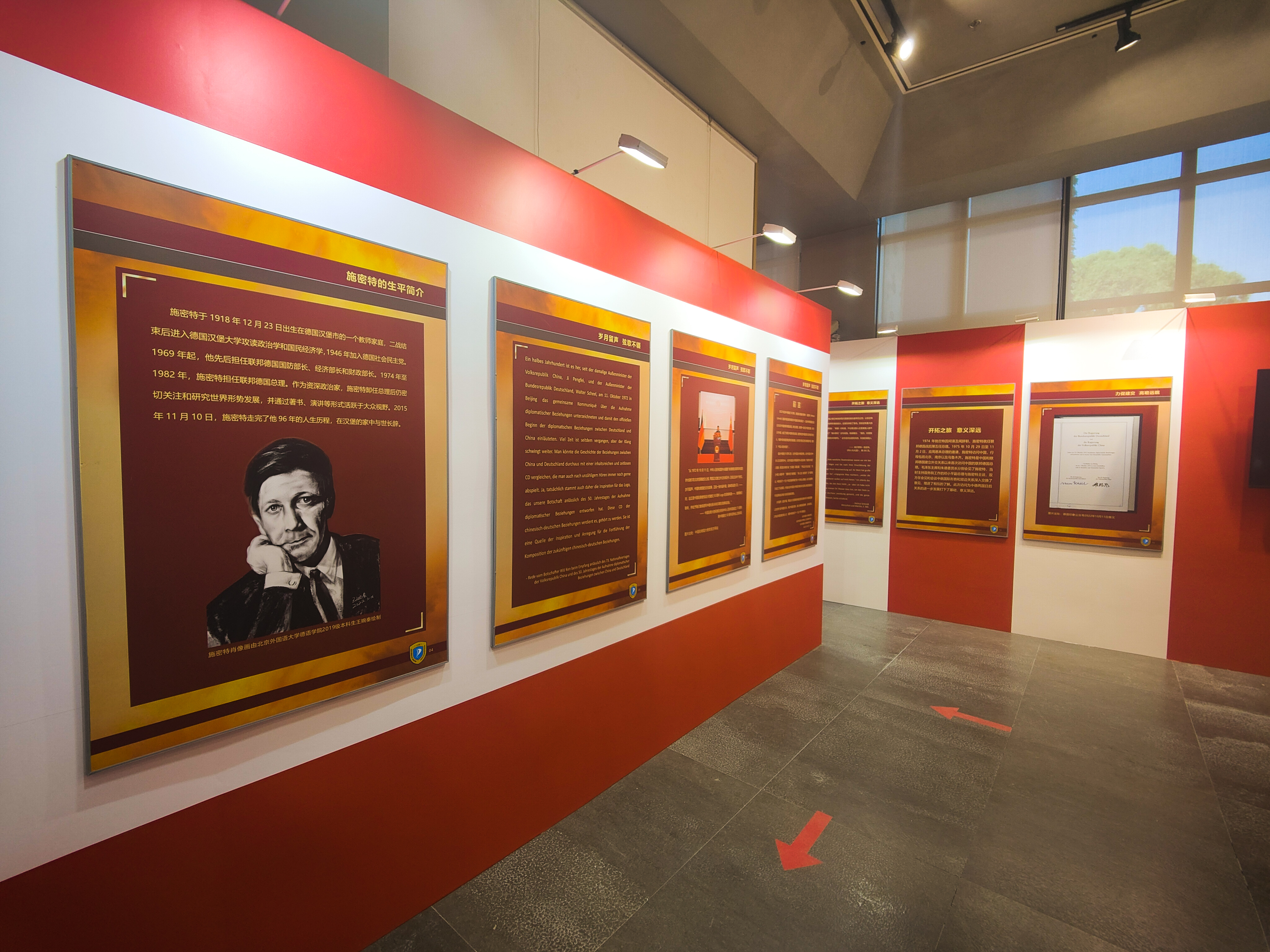 为纪念中德建交50周年,Beat365中文官方网站、Beat365中文官方网站中德人文交流研究中心、Beat365中文官方网站德国研究中心于2022年10月18日至11月底推出了“施密特与中国”主题展,展览的主体部分由“力促建交 高瞻远瞩”“开拓之旅 意义深远”“关注中国 步履不停”“理解中国 笔耕墨耘”“斯人已去 余音犹存”五个篇章组成。中德关系下一个五十年的发展寄希望于新一代年轻人的推动,主题展特别设立了互动展区,介绍由Beat365中文官方网站本科生团队承担的国家级大学生创新创业训练计划项目的建设情况。