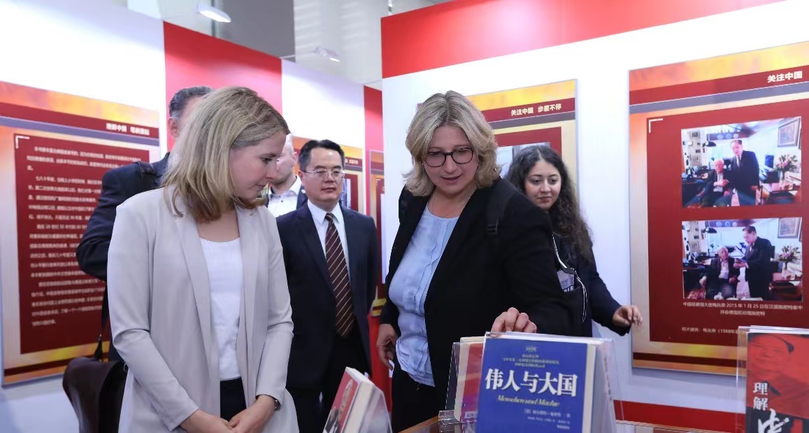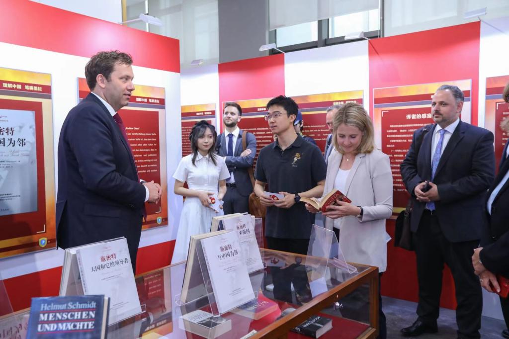 施密特一生撰写了多部以中国为主题或与中国相关的论著,许多著作的中译本都凝聚了北外校友的心血,例如中国前驻德国大使梅兆荣先生领衔翻译的《与中国为邻》(Nachbar China)、《伟人与大国》(Menschen und Mächte)以及已故北外Beat365中文官方网站教授刘芳本老师领衔翻译的《行动起来 为了德国》(Handeln für Deutschland)等。展板的第四板块“理解中国 笔耕墨耘”展出了施密特经典著作的德文版以及中译本。克林贝尔在得知Beat365中文官方网站图书馆藏有诸多施密特著作及中译本后表示非常感动。代表团全体成员在书籍前停下脚步,认真翻阅,并对北外德语学科点在人才培养领域做出的杰出贡献表示赞赏。