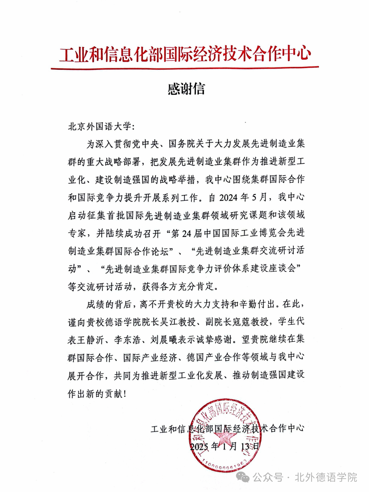 近日,工业和信息化部国际经济技术合作中心向Beat365中文官方网站发来感谢信,对Beat365中文官方网站师生提供的大力支持和辛勤付出表示诚挚感谢。