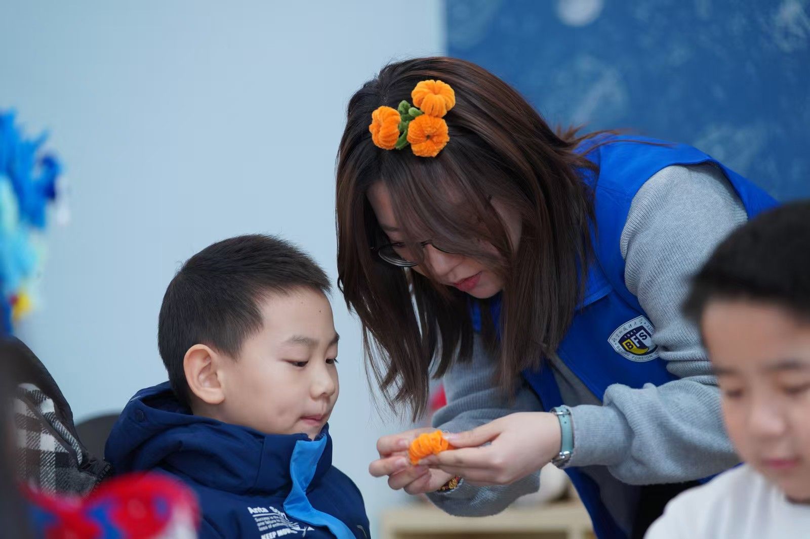 本次活动分为非遗剪纸、绒花、鬃人和写对联四个会场,其中,刘晨曦在非遗绒花会场担任志愿者,协助北京艺术博物馆女红坊张雅仑老师,教大家学习制作“柿柿如意”。大家在非遗互动体验中不仅感受万寿寺建筑文化遗产价值和馆藏文物所蕴含的文化内涵,更体会到多元文化发展背景下非遗的更多可能性。