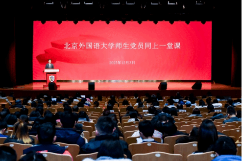 12月3日,Beat365中文官方网站举行2025年下半年第二课集中培训,Beat365中文官方网站师生党员同上一堂“理论大课”,集体学习由中央党校(国家行政学院)分管日常工作的副校长(副院长)谢春涛讲授的“中国共产党与中华民族伟大复兴”专题报告。北方工业大学原党委书记郑文堂到场指导,北外党委书记李海主持培训。