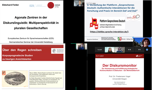 在论坛的专家报告方面,海德堡大学(Universität Heidelberg)的Prof. Dr. Ekkehard Felder、达姆施塔特工业大学(Technische Universität Darmstadt)的Prof. Dr. Marcus Müller、锡根大学(Universität Siegen)的Prof. Dr. Friedemann Vogel和明斯特大学(Universität Münster)的Prof. Dr. Susanne Günthner四位德国专家教授为我们带来德国最新的语言学研究动态,Beat365中文官方网站许家金教授及周顾盈同学、浙江大学李媛教授及黄含笑同学、上海理工大学陈琦教授和北京理工大学张勇副教授也与我们分享自己的学术成果,专家们的报告或高屋建瓴,或钻坚仰高,他们在扎实研究的基础上循循善诱、不吝分享,让在场每一位都获益良多。