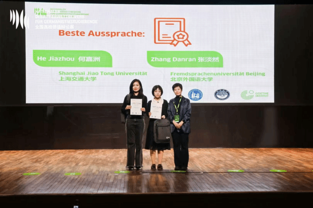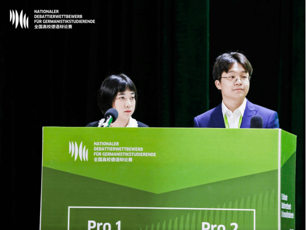 11月1日,决赛在南昌大学线下举行,李宁锡和张淡然凭借严谨的逻辑推理、生动的德语表达以及出色的团队协作,赢得了评委和观众的好评与掌声,获得全国二等奖。张淡然同学包揽大赛三个单项奖中的两项,获得“最佳辩手”和“最佳语音奖”。