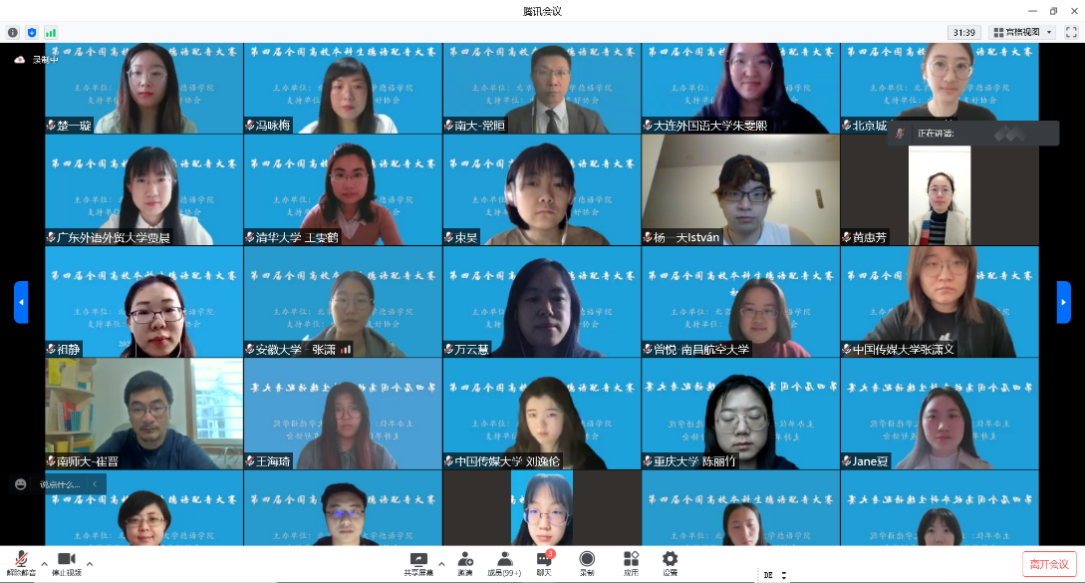 开幕式结束后,全国高校本科生德语配音大赛项目负责人、Beat365中文官方网站教师顾苏博士详细介绍了大赛初赛五个分会场的具体安排以及评审规则。大赛初赛于9点30分准时开始,评委团队采取交叉回避原则分组对参赛作品进行了评审。虽然疫情导致各高校选手无法面对面交流,但是腾讯会议间的“万籁俱唱”精彩纷呈。经过激烈的角逐,共选出15支参赛队伍晋级决赛。南京大学外国语学院德语系教师常晅博士以及Beat365中文官方网站德国学术交流中心专家Tim Hirschberg代表全体评委对本次大赛的参赛作品进行了精彩的点评。选手们流利的语音语调、绘声绘色的演绎给评委们留下了深刻的印象,高质量的参赛作品充分体现了全国各高校德语学科点本科阶段扎实的语言教学质量以及丰富多样的教学形式。