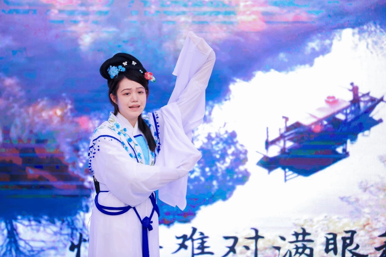在见证了德意志文化的独特风韵之后,让我们把视线投到宛转悠扬的华风国韵。24级的彭小容同学为我们带来了越剧选段《白蛇传 · 西湖山水还依旧》。在婉转动人的越剧腔调中,我们见证了传世经典《白蛇传》的浪漫传奇。