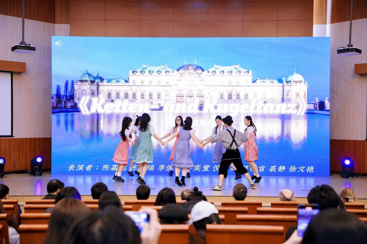 晚会首先在陈卓瑞、陈嘉懿、李依寰、李奕萱、倪凯莉、裴悦言、裘静、徐文艳同学带来的德国民族舞蹈《Ketten- und Kugeltanz》中拉开了帷幕。舞者们默契的配合,展现出了如同链条般环环相扣的舞步。他们用旋转与跳跃的灵动欢悦诠释了日耳曼民族的热情与豪迈。