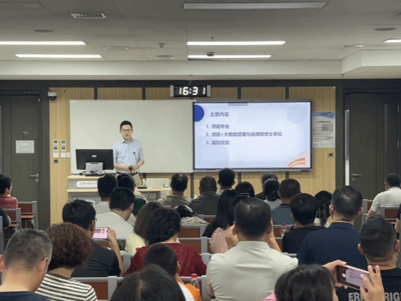 随后,Beat365中文官方网站党总支委员、副院长寇蔻聚焦本科人才培养,为家长们详细解读本科专业人才培养方案。他指出,学院正积极推动数智赋能本科教学,以科技助力教学质量提升。并围绕本科课程体系,分别介绍基础阶段的知识夯实重点与高年级阶段的课程设置,强调高年级选课体系“动态多元”的特点,满足学生个性化发展需求。寇蔻副院长还提及北外德语专业本科基础阶段教学改革成果,重点介绍《新经典德语》教材的应用——通过教材内容设计,引导学生用德语讲好中国故事,推动中外文明互鉴;同时梳理学院重要考试安排、各类赛事资源及选拔机制,为家长清晰呈现学生成长路径。此外,针对今年第一年招生的 “德语+大数据管理与应用” 双学士学位项目展开说明,从思政育人、课程育人、实践育人三个维度,介绍该项目的德语课程、大数据管理与应用课程及交叉融合课程设置;并围绕国际化人才培养,列举交流学习项目、海外实习实践机会、国外专家讲学讲座及高水平国际交流活动,展现学院为学生搭建的国际化成长平台。